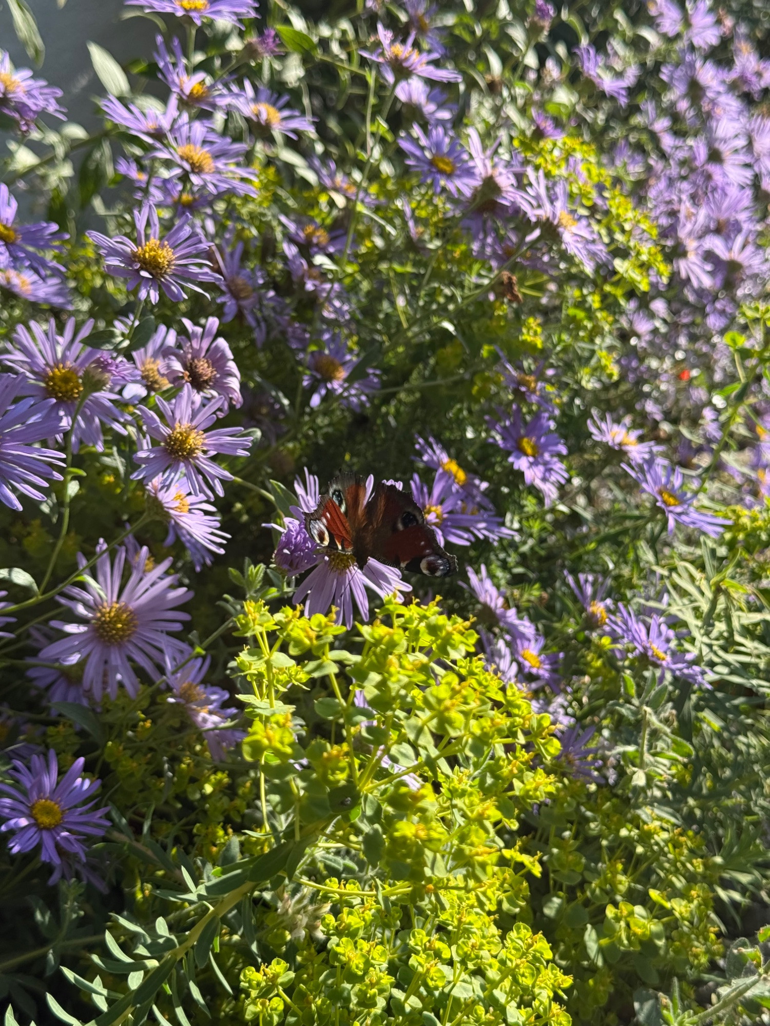Interessanterweise war die Aster Frikartii den ganzen Sommer über für die Schmetterlinge eher uninteressant, da es wohl bessere Alternativen gab. Jetzt sind die Falter anspruchsloser geworden, und ich sehe immer mehr von ihnen auf dieser Pflanze.
