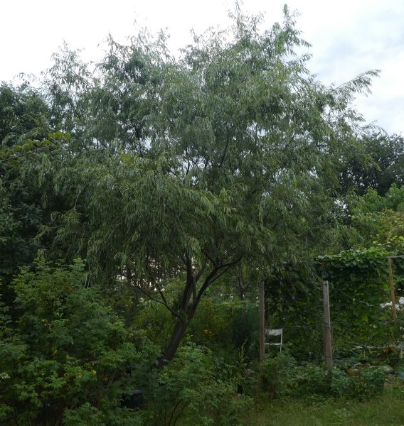 Ich weiß nicht, wie oft ich es schon versucht habe, meine Monstersalix zu fotografieren. Es ist Salix acutifolia 'Blue Streak', einst aus einem Steckholz gezogen, das AndreasNB mir gegeben hatte. Eigentlich steht der Baum etwas unpraktisch und spendet dem Gemüsebeet rechts zu viel Schatten. Außerdem muss man sich etwas an ihm vorbeischlängeln. Aber schön ist er (falls man das auf dem Foto erkennen kann :-\).