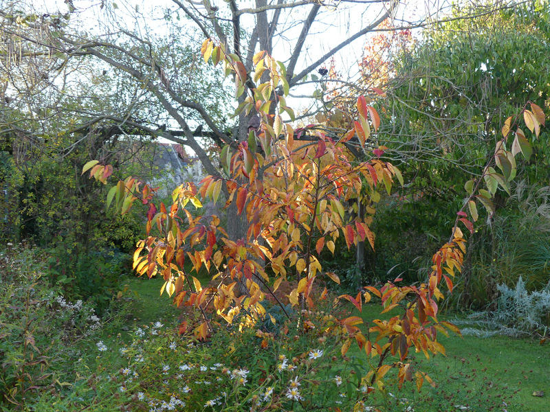 Prunus serrulata 'Royal Burgundy' steht wie eine Fackel vor dem Liriodendron.