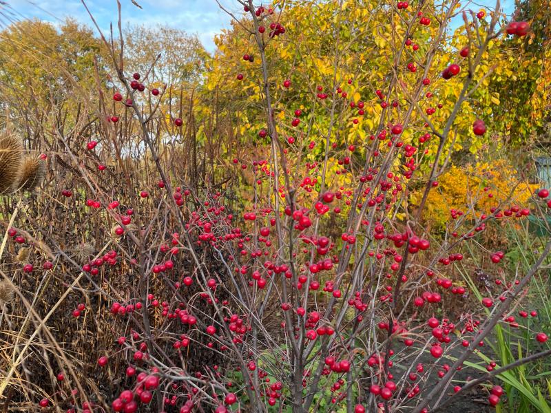 Vor einigen Jahren tauchte ein kleinblättriger, im Sommer hellgrüner Berberitzensämling am Hühnerstall auf. Inzwischen hat er Format und leuchtet gerade in wunderbarer Herbstfärbung.