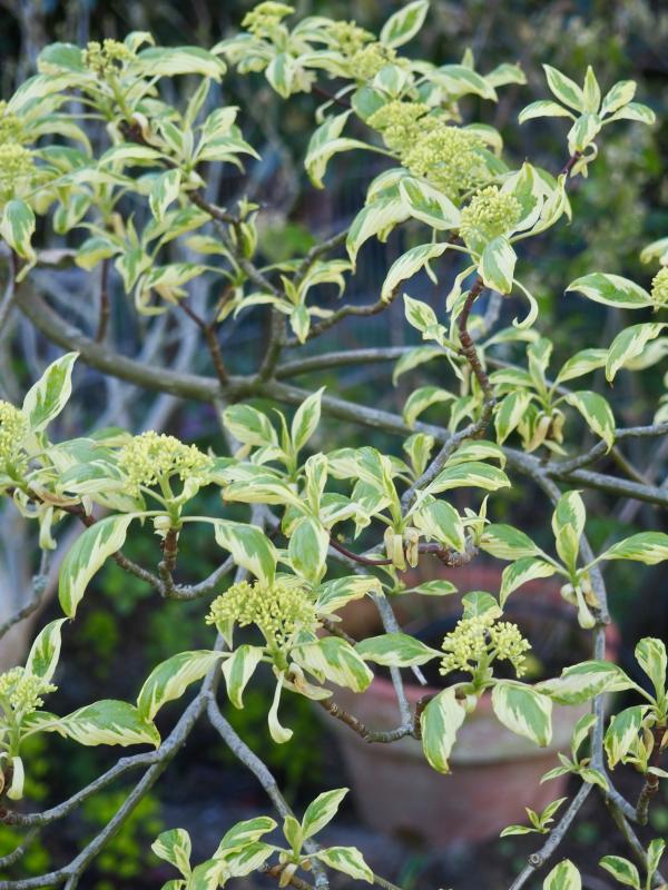 was habt ihr für faszinierende Gehölze. Zum Beispiel Cercis Canadiensis. ich habe zurzeit ziemlich viel Spaß an meinem Etagenhartriegel variegata. Es ist das erste Jahr, in dem ich mich auf eine Blüte ohne erkennbare Frostschäden freuen kann.