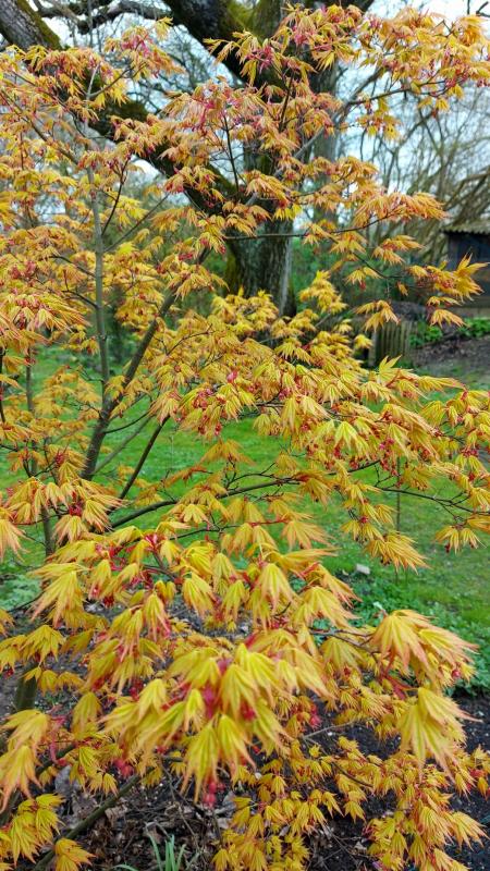 Immer besonders, wenn er austreibt, ist Acer palmatum 'Orange Dream'. Stand hier knapp 15 Jahre im Kübel herum, bis sich letztes Jahr endlich ein Platz fand. Trotz meiner Gelbmanie überlege ich gerade, den jetzt mit gaaanz dunkelroten Primeln zu unterpflanzen.