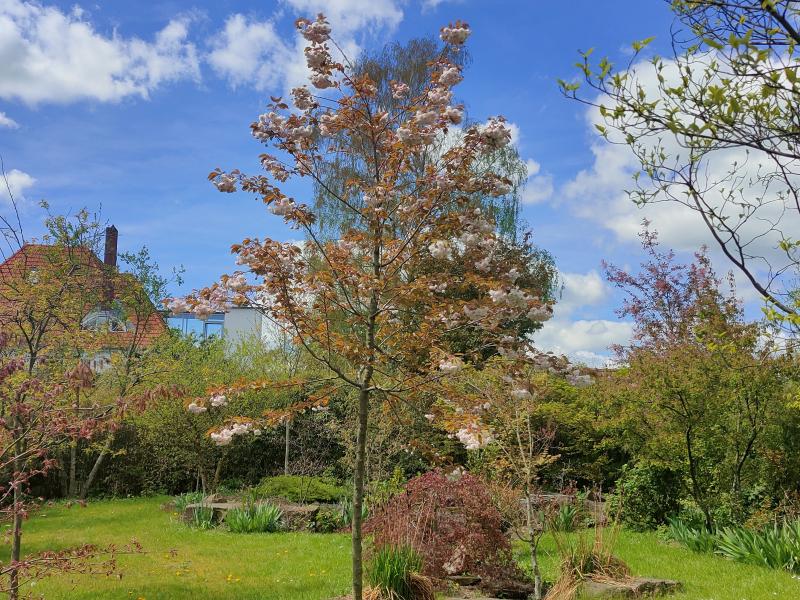 Prunus serrulata 'Shirofugen' im hinteren Garten blüht schon ganz ordentlich, kann aber nicht mithalten...