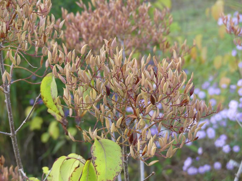 Syringa pekinensis fällt gerade durch seine Samenstände auf.
