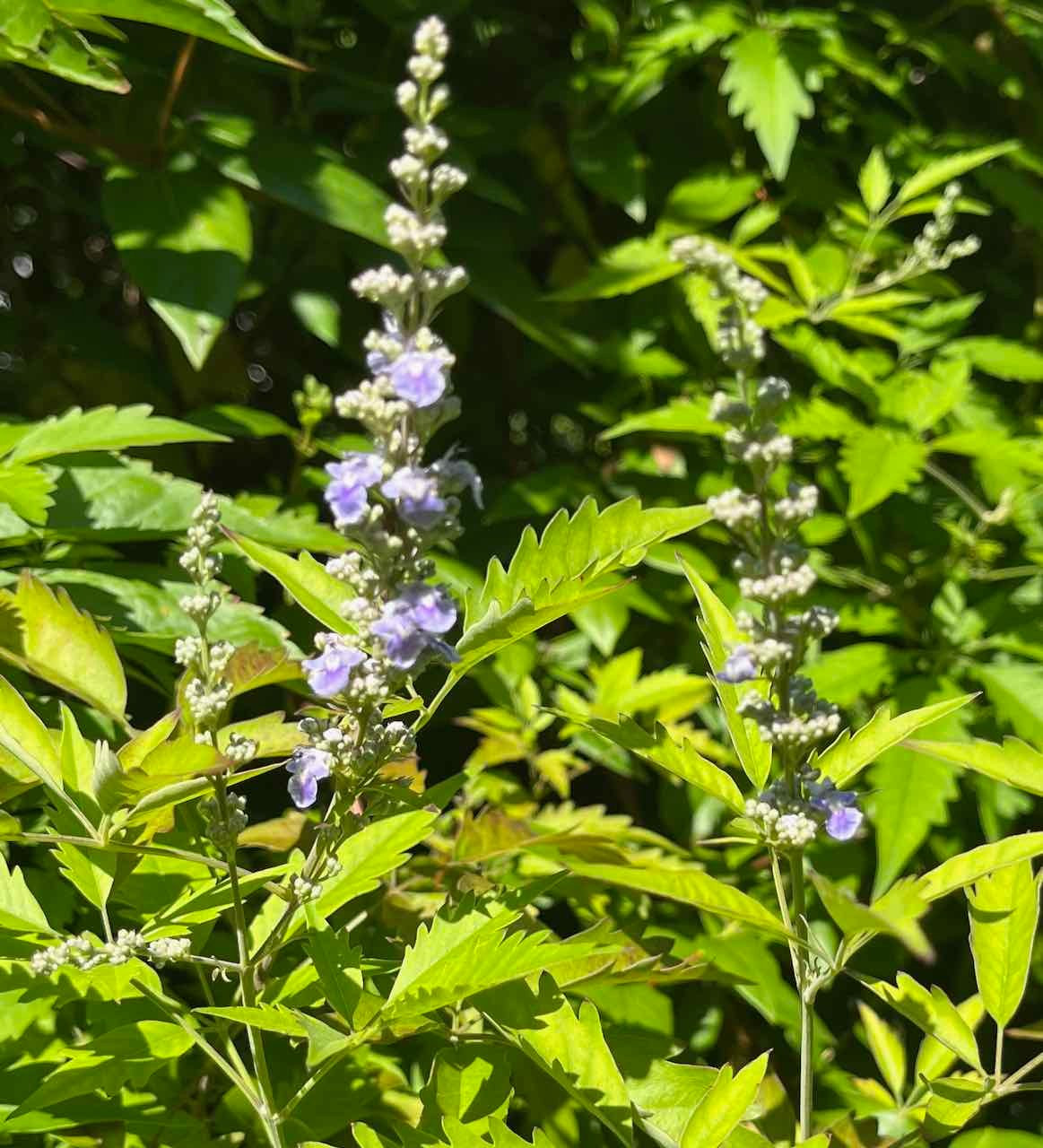Vitex negundo, der chinesische Mönchspfeffer beginnt zu blühen. Er ist inzwischen 2,5 m hoch und völlig winterhart.