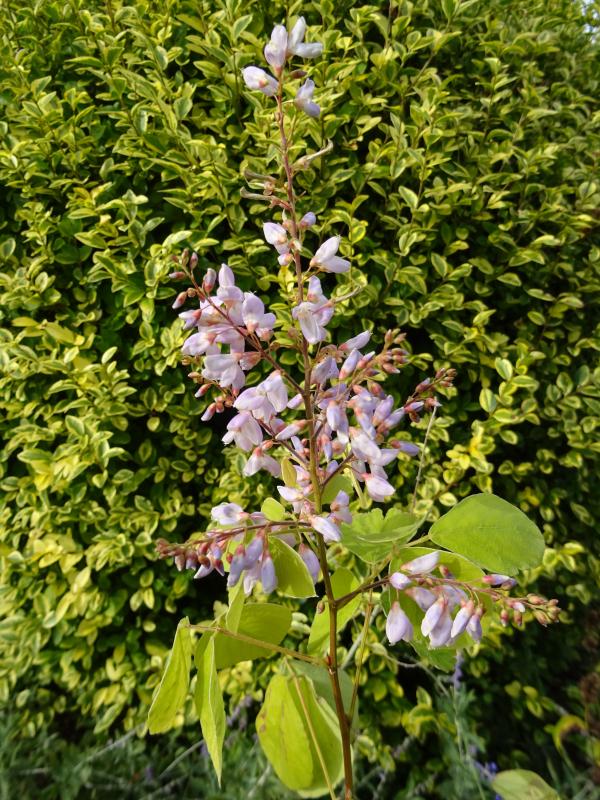 Halbwegs zwisschen Gehölz und Staude: Desmodium elegans (synoniem Desmodium tiliifolium).
