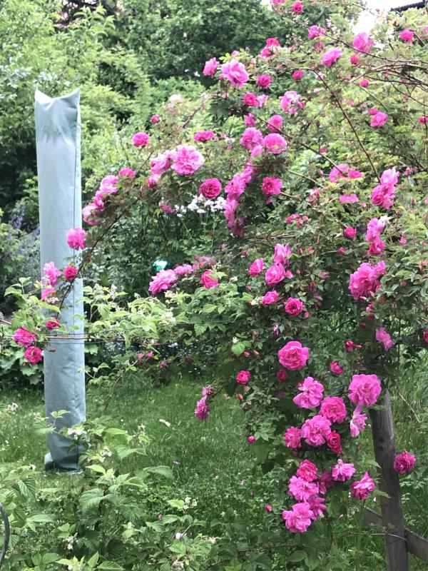 Die Inermis Morlettii wird von Jahr zu Jahr schöner! Weil ich sie letztes Jahr (leider) nicht geschnitten habe, breitet sie sich malerisch über den Wäscheplatz und die Himbeeren aus: