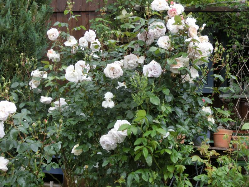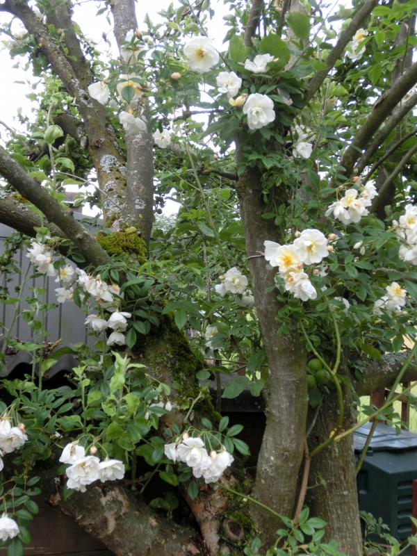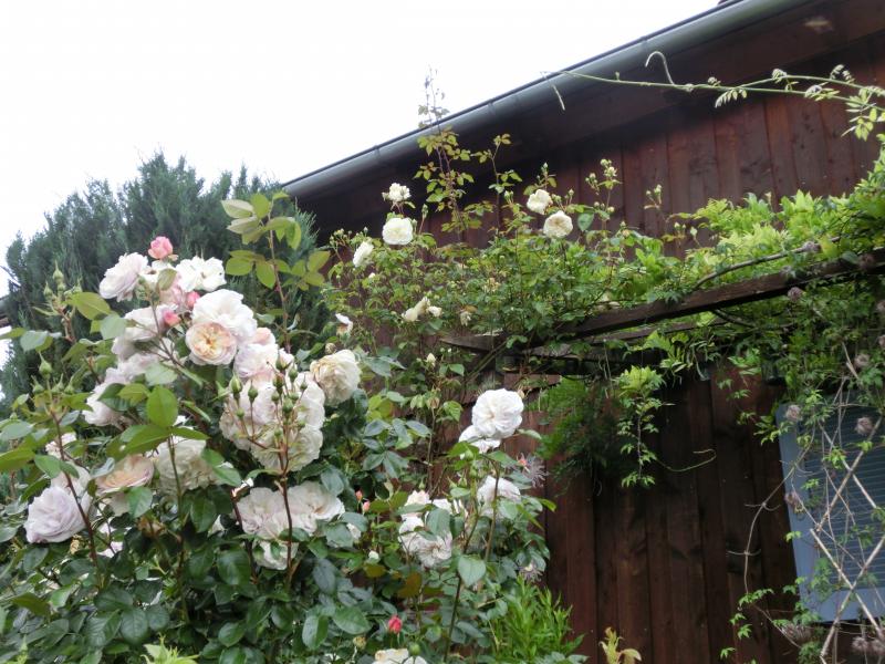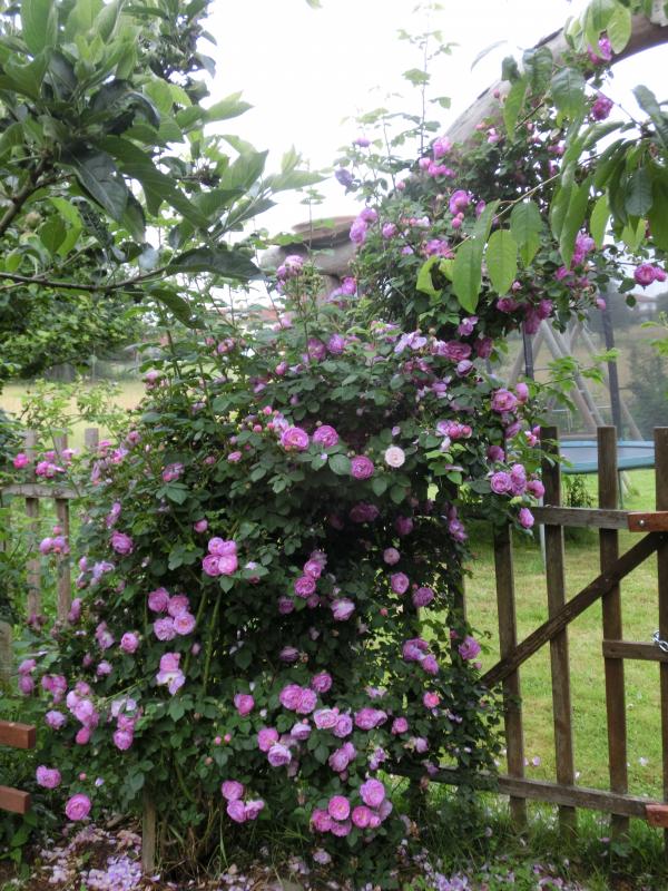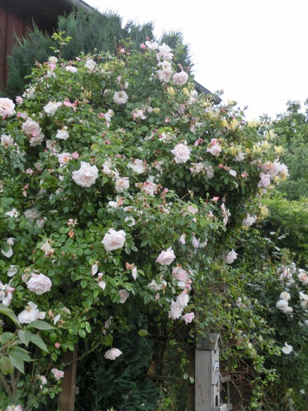 New Dawn (noch ungeputzt nach vier Tagen Dauerregen) und Japanisches Geißblatt (Lonicera halliana).