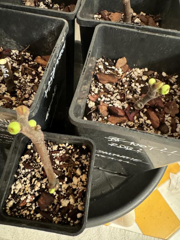 Ich bewurzle jetzt - Boticario, eine unbekannte Sorte aus dem Hochland unweit von Almeria - Cielo Verde, eine Lorusso Sorte - Bordissot Rossa, eine Pons Sorte - Cuello de Paloma negro, aus dem Hochland bei Granada. Hier ist mir vor 2 Jahren das Bewurzeln nicht einmal bei einem der drei Steckhölzer gelungen, während es bei den anderen gleichzeitig bewurzelten Steckhölzern eine Erfolgsquote von 100% gab. Auch 2023 scheiterte ich bei dieser Sorte (ein Steckholz) wieder als einzige.