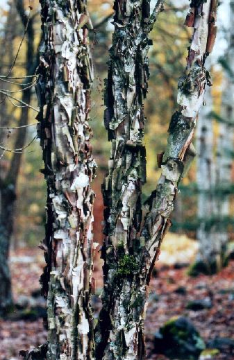 Hmm, sieht zwar etwas pimpfig aus, das Foto, läßt sich aber angemessen vergrößern....Hier jetzt die ganz dunkle Variante der B. utilis var. utilis (die übrigens auch fast weisse Stämme hervorbrachte - die habe ich aber nicht fotografiert, da ich mich mehr für die Dunklen interessiert habe). Leider ist die extrem dunkle Färbung auf dem Foto durch den sonnigen Lichteinfall nicht mehr so ganz nachzuvollziehen. Die Rinde war fast schokoladenbraun. Im Katalog einer englischen Gärtnerei entdeckten wir später einen Verkaufsnamen Betula 'Wakehurst Chocolate'... das muss eine Veredelung dieser Schwarzen sein! Leider war kein Exemplar mehr vorhanden, sonst hätten wir die Birke nach Deutschland eingeführt...