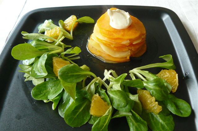 Heute gab es:Kürbissuppe mit MacaKartoffeltürmchen mit Feldsalat