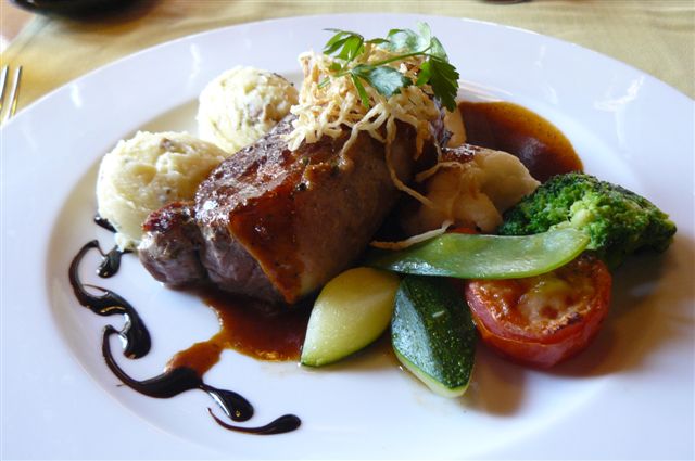 danach ein Kalbssteak mit getrüffeltem Kartoffelpüree und Gemüse