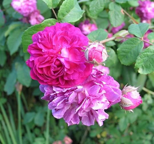 Meine Cardinal de Richelieu passt eigendlich auch hier her. Je länger die Blüten offen sind, um so mehr nimmt die Farbe einen gräulichen Ton an. Die Unterseite der Blütenblätter hat von Anfang an einen blau-graustich. Ich hoffe auf dem Bild kann man es gut erkennen. Sie blüht sehr üppig, aber leider nur einmal im Frühsommer. Ich finde ihre Farbe etwas ungewöhnlich.