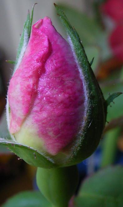 Sieht so aus, als wenn auf der rechten Seite, Mitte der Knospe eine grüne Blattlaus ihren Hunger stillt.Kann mich aber auf die Entfernung auch irren