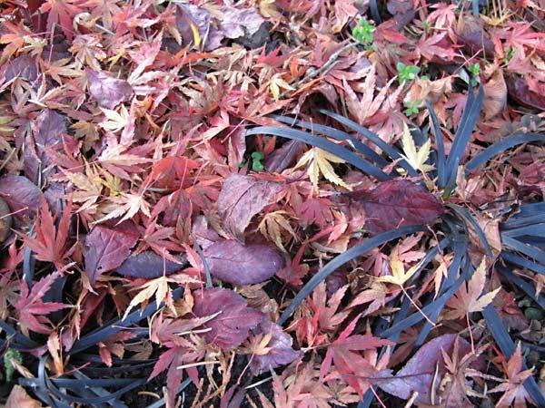 Hier herrscht übrigens Ordung obwohl Laub liegt. Die neugepflanzte Fläche von Sagina subulata wird durch den Wind ordentlich mit Blutpflaumenblättern gerahmt.