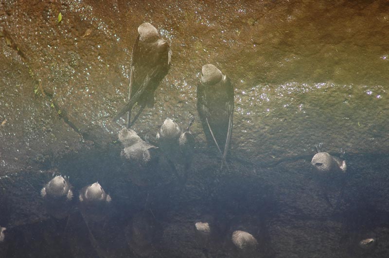 Unter anderem Rußsegler, eine mit unseren heimischen Mauerseglern verwandte Art. Wenn man sie genauer beobachtet, sieht man, dass die Tiere mitten in die Wasserfälle hineinfliegen.