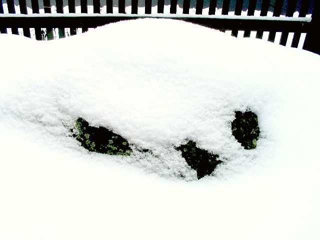 Damit wir nicht übermütig werden. :-XEigentlich hatte es heute bei Sonnenschein fast alles weggetaut. Vor 30 min begann es wieder zu schneien. So sieht es jetzt aus, wenn man aus unserer Küche herausschaut.LG, Bea