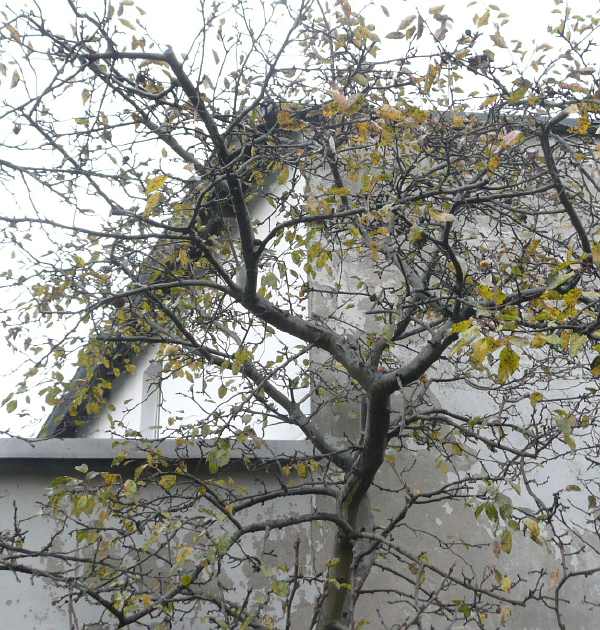 Der Habitus (vielleicht beeinträchtigt durch den Standort nahe der Mauer und zwischen den beiden Reineclauden und obendrein seit Jahren nicht geschnitten.