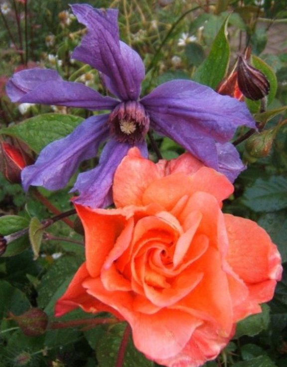 Da BB ins orangefarbene geht, halte ich Rottöne für gefährlich. Ich habe von ganz früher her noch an einer Stelle eine "Sympathie" in der Nähe einer "Madame Galen" sitzen - übel. Gehört zu den diversen Dingen, die ich noch ändern muß. Blaue, violette und cremefarbene Töne, ggfs. gelb, halte ich als Kombipartner für wesentlich besser geeignet. Rote Clemis setze ich vorzugsweise zu weißen oder auch gelben Rosen ohne Orange-Touch.
