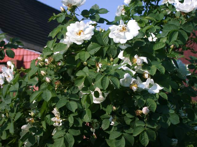 Bei mir wächst nur die Albarose 'Sappho'. Sie ist weiß, halbgefüllt, wächst ziemlich aufrecht, etwa 2.20 hoch.Das Laub ist hervorragend gesund, und im Herbst hat sie schöne rote Hagebutten.