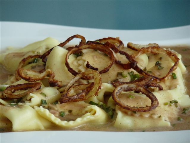 *doppelseufzer*... Es gab Ravioli mit einer Zwiebel-Ricottafüllung an einer Marsala-Zimtsauce, zuvor gab es einen Karottensalat mit gehackten Pistazienkernen