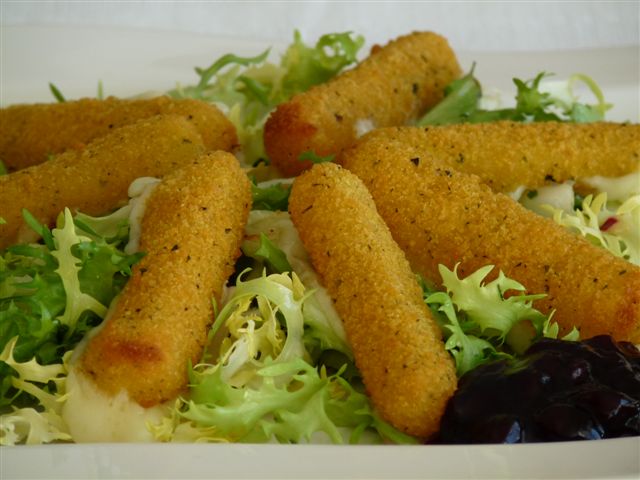 Heute gab es panierte Mozarellasticks auf Friséesalat und Preiselbeeren