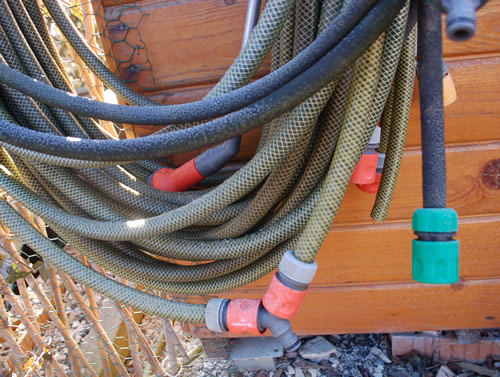 - und vielleicht sogar zulässt, gleichzeitig an mehreren Stellen zu wässern, wird dieser Nachteil wieder aufgehoben. Gegen Spatengefährdung hilft es, die Schlauchschlängel hübsch gleichmäßig zu legen (analog zu Stromleitungen im Haus, die kann man beim Löcherbohren ja auch gut umgehen