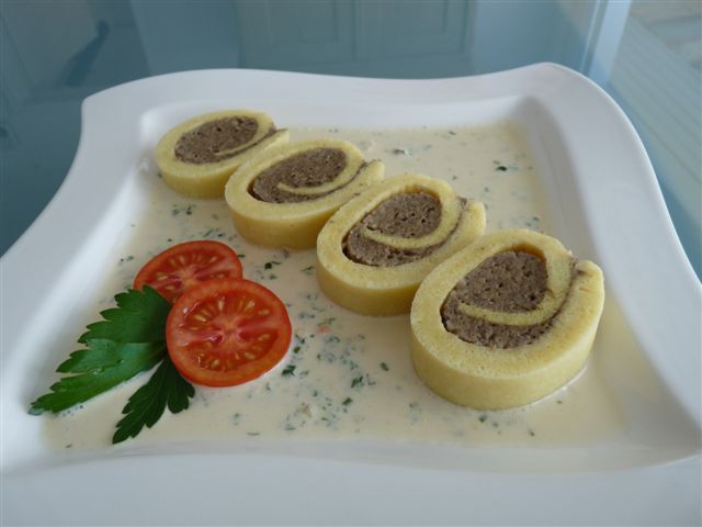 Danke JayEs sind frische braune Zuchtchampignon, tiefgefrorene Herbsttrompeten und Habichtpilz als Pilzpulver.Ich habe die Pilze in wenig Butter gedämpft, püriert, die Masse in einem Sieb etwas abtropfen lassen, mit einer eingeweichten, gut ausgedrückten Semmel, etwas Quark und Eigelb vermengt, auf ein Omelette gegeben, eingerollt und wie ein Serviettenknödel im heissen Wasser ziehen lassen.