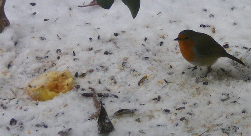 Ich hatte heute einen Rotkehlchen-Rambo. Er hatte länger als eine halbe Stunde die Kontrolle im Futterhäuschen übernommen, schlug sich den Wanst voll und unterbrach das nur, um Amseln in die Flucht zu schlagen.Übrigens wurden inzwischen die "roten Augen" der Blutorange angenommen und gefleddert. Der Schnee ist überall pink gesprenkelt.