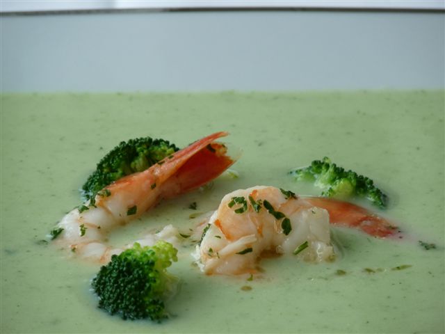 danach:Broccoli-Kokosnuss-Suppe mit Garnelenserviert im "Pool"