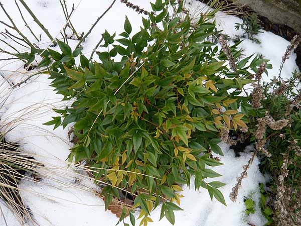 Hier ein aktuelles Bild einer Nandina aus dem Freiland. Sie wurde letztes Jahr relativ spät gepflanzt. Bis jetzt ist sie in Ordnung (sie hat schon vor der Pflanzung so gerupft ausgesehen).