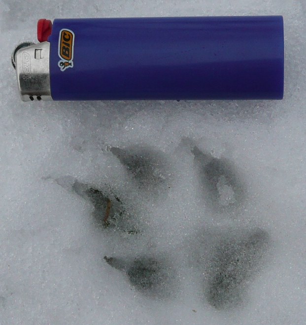 Darf ich mich hier dranhängen?Im Garten taut der Schnee und Spuren gab es heute jedermenge. Zum Beispiel eine, die ich für eine Fuchsspur halten würde. Irritiert war ich nur von der Größe: der Fußabdruck ist 7cm lang und 6cm breit. Haben Füchse wirklich so große Füße?