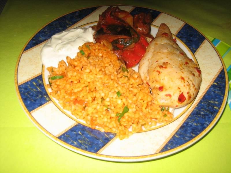 Gestern waren wir zum Essen eingeladen!Es gab eine leckere rote Linsensuppe, Foto machen vergessen.Danach Bulgur, medit. Gemüse und scharf eingelegte Hähnchenbrust. Zusätzlich noch SalatAls Nachtisch, Türkischer Joghurt mit Honig und gehackten Nüssen dazu Feigen und Orangen.War alles sehr lecker. Bilder kommen im Anhang.