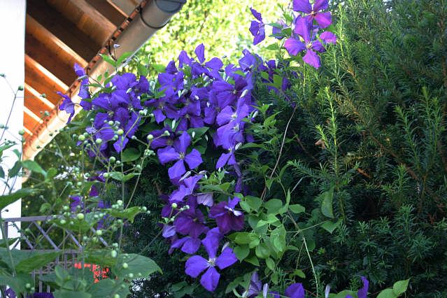 Erfreuliches Thema, schöne Bilder!Mal gucken, ob ich auch noch welche finde, die hier nicht schon zu sehen waren ...Hier, C. int. Seeryuu, die ich hinter die Pfingstrosen gepflanzt habe. Sie hat schon Ende Mai geblüht! Clematis montana sind mir auch schon 2 erfroren oder auf tragische Weise umgekommen (von einem aus dem 3. Stock abgeworfenen Weihnachtsbaum an der Basis abgtrennt!)Die dritte, die ich im Frühjahr pflanzen will/wollte, wurde noch vor Weihnachten von starkem Frost im Topf erwischt ... mal sehen, ob sie noch lebt.