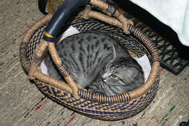 Oh Seppi, was biste ein Süßer!Du hast übrigens genauso ein spitzes Gesichtchen wie unser kleiner Muck, nur ist Mucki ein "Brauntiger". Trotzdem, Ihr könntet wirklich Brüderchen sein.Und wow so einen tollen Korb haste!