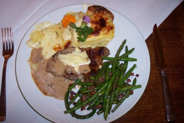 heute gab es rindersteak mit kartoffelgratin, speckbohnen und pfeffersosse.