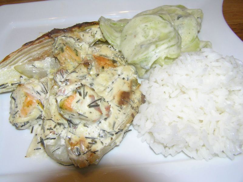 und heute chicoree-lachsgratin mit reis und gurkensalat.beide bilder leider wieder ziemlich überbelichtet