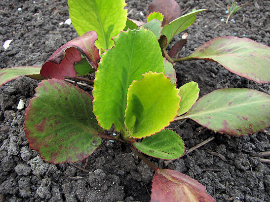 Der letzte Winter war sehr gut geeignet die Winterfärbung der Bergenien zu testen. Am allerbesten von einem Dutzend Sorten schnitt bei mir 'Rote Schwester' ab. Hier gibt es ein Bild. So richtig zierend sind die Blätter bei Winterwetter nicht. Sobald es etwas wärmer wird erholen sie sich aber bei manchen Sorten - und bei der 'Roten Schwester' hier am besten.
