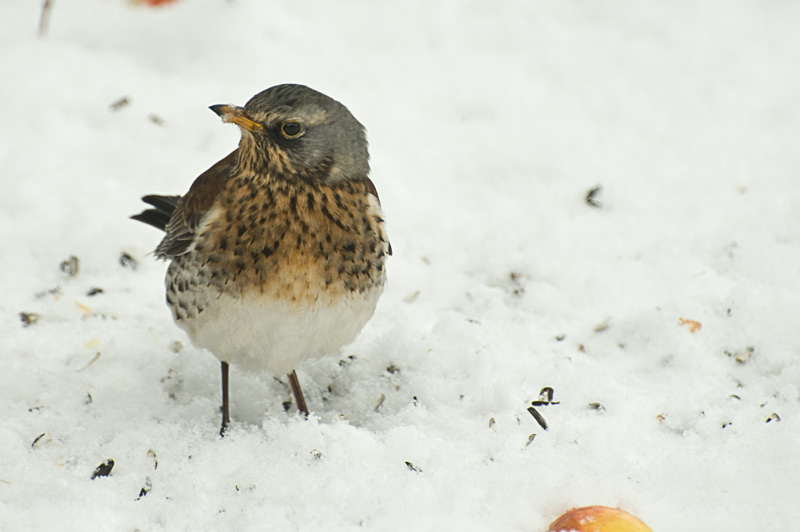 "Meine" Wachholderdrossel hat sich auch nur für die Äpfel interessiert, am unteren Bildrand kann man ein Stückchen davon sehen.