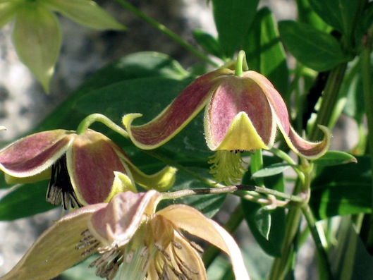 Clematis 'My Angel' hat sich bei mir als großes Unkraut entwickelt. Sie sät sich aus und wuchert alles zu, wenngleich die Einzelblüten sehr hübsch sind, wie wir oben sehen können. Ich glaube, von den Viticella-Sorten ist keine Einzige mehr rein, es sind dies alles Hybriden. Es wäre jedoch durchaus interessant, wieder einmal Clematis viticella vom Naturstandort zu kultivieren. Ich hatte vor vielen Jahren einige Sämlinge aus einem rauen Gebiet Zentralbosniens, die sich als sehr vital entpuppten.Ein wunderbarer Sommerblüher ist 'Huldine'.