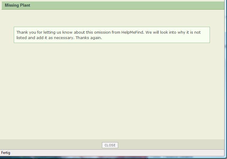 Ich bin ein Dödel, habe eben gesehen, daß bei dem Reiter ganz rechts "Add Plant to HMF" steht: "Add New / Missing Rose to HMF". Deshalb habe ich da jetzt mal noch 8 2009er-Sämlinge nachgetragen. Ich trag nicht alle ein, nur die, die ich für erwähnenswert halte.An alle Garten-Pur Mitglieder, die Besitzer meiner Rosenzüchtungen sind (Lubuli, Loli, Rosana, Zwerggarten, Roro, marcir und Irisfool): Ihr könnt also gerne diese Saison Bilder von den Röschen in HMF hochladen, das würde mich freuen. Sollten sich einzelne Rosen zu unvorteilhaft entwickeln, was ich ja jetzt noch nicht ausschließen kann, kann ich sie dort immernoch löschen. Sollten welche der Rosen verstorben sein, ist ja bei den Überraschungseiern auch möglich, bitte auch mir mitteilen, dann muß ich sie natürlich auch löschen.Sobald die neuen 8 in HMF drin sind, meld ich mich hier nochmal mit dem entsprechenden Link.Danke Rosana.Ach so, das hatte ich auch schon probiert, ich hatte dann irgendwie das Gefühl, das ist für andere Sachen gedacht... Gut probier ich nochmal... ja, kuck, nachdem ich da eine neue Rose von mir eingetragen hab und das abeschickt hab, kommt diese Meldung in nachfolgendem Screenshot, das ist also wohl gedacht um Pflanzen nachzutragen, die es bei HMF schon geben sollte, die aber aus irgendwelchen Gründn bisher "durch die Lappen gegangen sind", vermute ich. Ich warte jetzt mal ab, ob da eine Antwort von HMF kommt.Danach sollte dieses Fenster aufgehen.