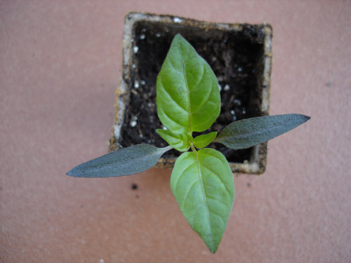 Och, das ist aber traurig, wenn die jungen Chilis schon kränkeln. Hast du dieselben Aussaatgefässe wie letztes jahr, Tina?Meine Chilis entwickeln sich gut, :DBesonders hübsch ist jetzt schon Bolivian Rainbow, 18 Tage alt: dunkle Keimblätter und eine feine dunkle Zeichnung im grünen Blatt.
