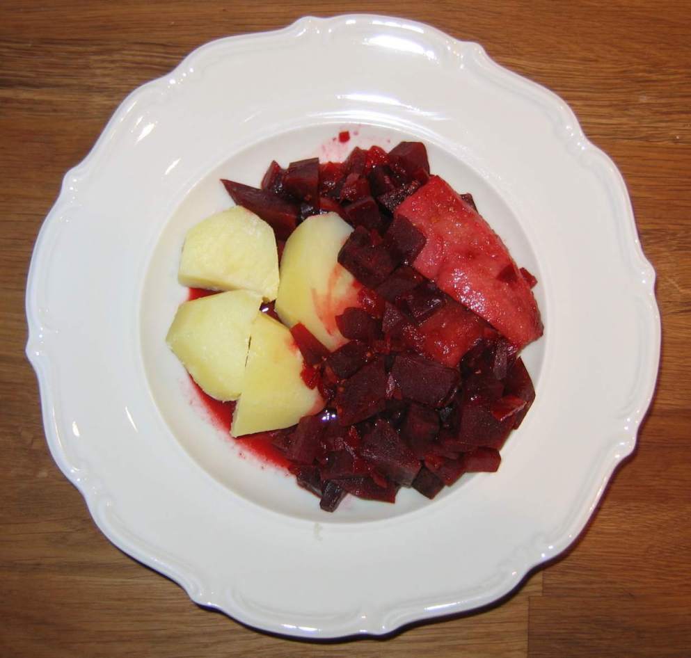 Hier gab`s heute rote Beete mit Birne. Ich mag dieses vegetarische Gericht sehr gern!