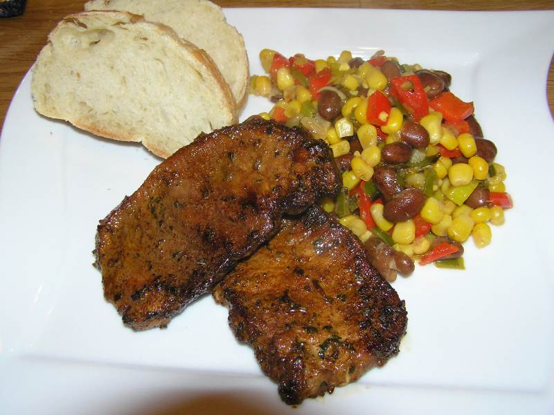 wir hatten heute marinierte schweinerückensteaks mit einem gemüse aus paprika, mais, lauch und borlottibohnen. dazu zwei scheibchen übrig gebliebenes ciabattabrot.gestern gabs übrigens straußensteaks mit selbstgemachten pommes (die nicht knusprig werden wollten
