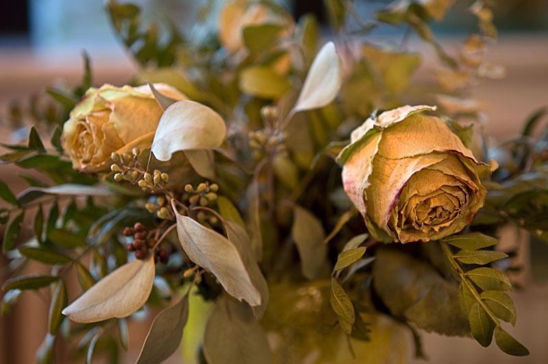 Die Farben der ersten Bilder sind authentisch, diese Rosen waren in frischem Zustand ein sehr helles grüngelbweiß, die Begleitpflanzen graugrün.Die Farben der zweiten Serie sind wärmer, weil elektrisches Licht die Oberhand hat.Mir gefällt hier das geblitzte Foto besser.Insgesamt habe ich gelernt, dass es nicht so leicht ist, die Entfernung zur reflektierenden Fläche und den richtigen Winkel für das bouncen zu finden.