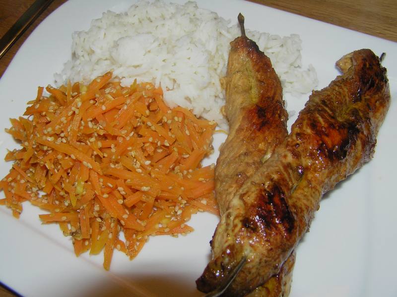 wir hatten heute mit tandoorigewürz und sojasoße marinierte putenspieße, dazu geröstete ingwer-sesamkarotten und basmatireis. nicht im bild: süße chilisoße dazu