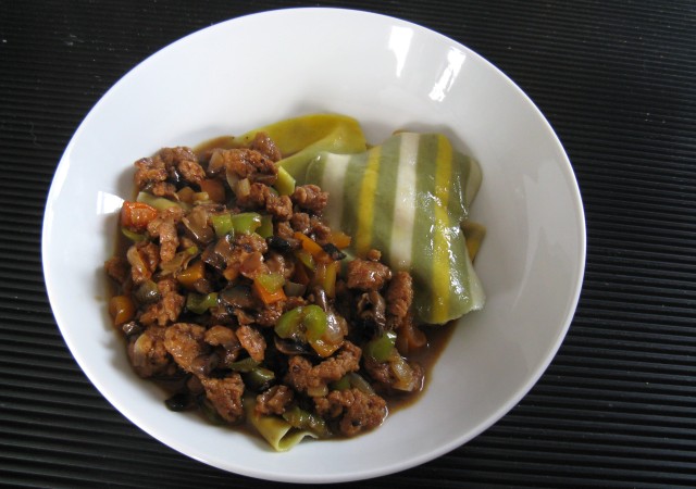 Es gab gestern marinierte Sojaklösschen (in Hoisinsauce und Tamari), orange und grüne Peperoni auf grossen farbigen Herznudeln. Leider waren die nach dem Kochen nicht mehr so richtig herzförmig