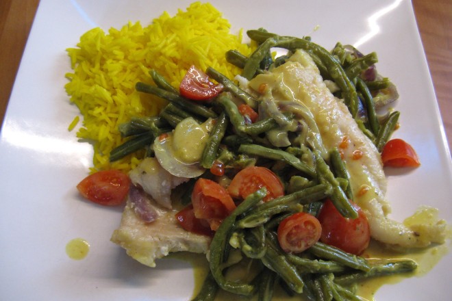 Und heute hab ich Steinbeisser gedünstet auf einem Bett aus roter Zwiebel und grünen Bohnen, mit frischem Zitronengras, viel Knoblauch und Ingwer. Zum Schluss kamen noch klein geschnittene Tomaten dazu und Reis, wie bei Paella gelb gefärbt.