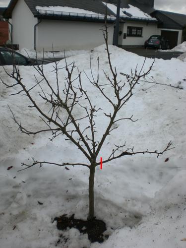 @aerobatic,selbst bei einem Alter von nur 5 Jahren und der rauhen Lage Rothaargebirge (wie hoch genau?) müssten die Bäume besser aussehen.Wahrscheinlich nie bis kaum geschnitten und deshalb auch die Vergreisungstendenz. Mit der Zuordnung Sorten zu Bildern könntest du richtig liegen, denn der Boskop sieht kräftiger aus als Elstar/Cox. Das passt.Das ihr eine Baumscheibe von ca. 1 qm unter den Bäumen freigehalten habt ist richtig. Das solltet ihr auch beibehalten. Die Düngung mit Rasenschnitt auch. Außerdem jetzt gegen Ende März ca. 2 cm hoch Kompost (alternativ handelsüblicher Dünger nach Gebrauchsanweisung) auf der Freifläche verwenden bzw. leicht einharken.Zum Korrektur- bzw. Erziehungsschnitt habe ich schon geschrieben. Das ist virtuell kaum vernünftig lösbar, sofern der Gegenüber überhaupt keine Basiskenntnisse hat. Da kann zu viel schief gehen. Das Buch ist schon sinnvoll. Nicht nur für den Obstbaumschnitt. Man lernt nebenbei noch einiges über Pflanzen/Gehölze. Dann nochmal konkret fragen.Zu dem Wegschnitt der gebrochenen Triebe aber folgendes:Die gebrochenen Triebe an der Basis, also dort wo sie vom Stamm oder größeren Ästen abgehen, abschneiden. Und zwar in etwa parallel zum Stamm schneiden (ca. 1mm "Rand" darf bleiben und ist sinnvoll).Aber bitte keine irgendwie gearteten Stummel stehen lassen.Wundverschluss ist bei den in Rede stehenden Wundgrößen verzichtbar. Gartenschere vorher auf Schärfe an Garten- oder Wildsträuchern (Haselnuss, Ahorn oder was auch immer) testen. Am besten dabei den oben beschriebenen Schnitt üben.Wenn die Schere stumpf ist und Quetschungen oder unsaubere Ränder verursacht, anderes Werkzeug besorgen.Wundränder hinterher im 1mm - Bereich mit sehr scharfem Messer bei Bedarf glätten, falls sie zu ausgefranst sind. Die Wunden nicht mit dem Finger betatschen und schneiden, wenn wenigstens ein paar Stunden nicht mit Regen zu rechnen ist. Grundsätzlich: Die beiden Bäume entsprechen weder einer Spindelerziehung noch einer Pyramidenkrone (Was sie nicht von Millionen anderer Hobbybäume unterscheidet). Dadurch wird es aber nicht besser. Wenn ihr die Bäume behalten wollt, muß man aus der vermurksten Kronenerziehung nun das beste machen. Hier kommt wieder die Aneignung von wenigstens Basiswissen ins Spiel.Die Bäume stehen vermutlich auf einer sehr schwachen Unterlage.Wahrscheinlich M9, vielleicht sogar nur M 27.Beide Unterlagen sind für eher schwere Böden(lehmig/tonig und damit wenig wasserdurchlässig) schlecht geeignet. Das würde die allgemeineKonstitution nicht gerade fördern.....Boskop kann selbst für Rothaargebirge noch gehen. Bis auf Frostrisse im Holz sonst relativ robust. Müßte auch noch gerade ausreifen.Elstar/Cox Orange sind beide per se Sensibelchen, die gerade in so unvorteilhaften Obstlagen noch sensibler reagieren. Sehr seltene Ausnahmen bestätigen die Regel.Ich empfehle in solchen Fällen: Lieber ein Ende mit Schrecken als ein Schrecken ohne Ende. Auch wenns wehtut.