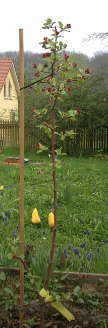 Den Ausführungen von frankste ist kaum etwas hinzuzufügen incl. des Pessimismus aufgrund der Erfahrungen mit Gartencentern/Baumschulen(wobei ich ausdrücklich nicht alle über einen Kamm scheren will).Einer Einschätzung möchte ich aber widersprechen. Eine schwach wachsende Tafelapfelsorte, z.B. Ananasrenette, wird auch auf Sämling als Hochstamm nie und nimmer 10 m Kronendurchmesser erreichen. Je nach Bodenverhältnissen und Pflege so um die 6-8 m.Soweit ich das der Ansicht nach beurteilen kann, lassen sich die meisten Zierapfelsorten auch in etwa in diese Kategorie einordnen.freitagsfish, du musst also auf keinen Fall Befürchtungen zu Übergröße haben.Bei deinem Bäumchen auf vermutlich schwacher Unterlage so und so nicht.